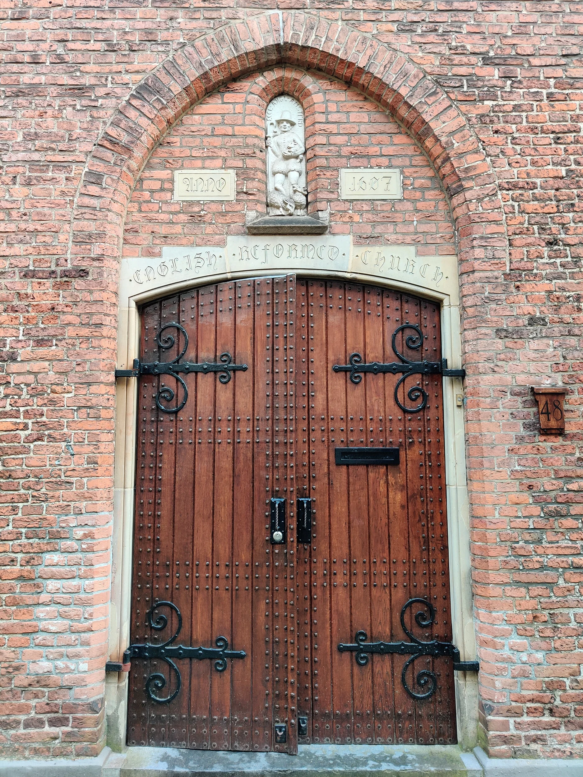 At the back of our chancel is the only stained glass window in the church, gifted in 1920 by Mr Edward Bok of the United States of America on the occasion of the 300th anniversary of the departure of the Pilgrim Fathers from Leiden to the New World. Many of the Pilgrim Fathers had previously lived in Amsterdam and this is marked by the presence of the window in our church.