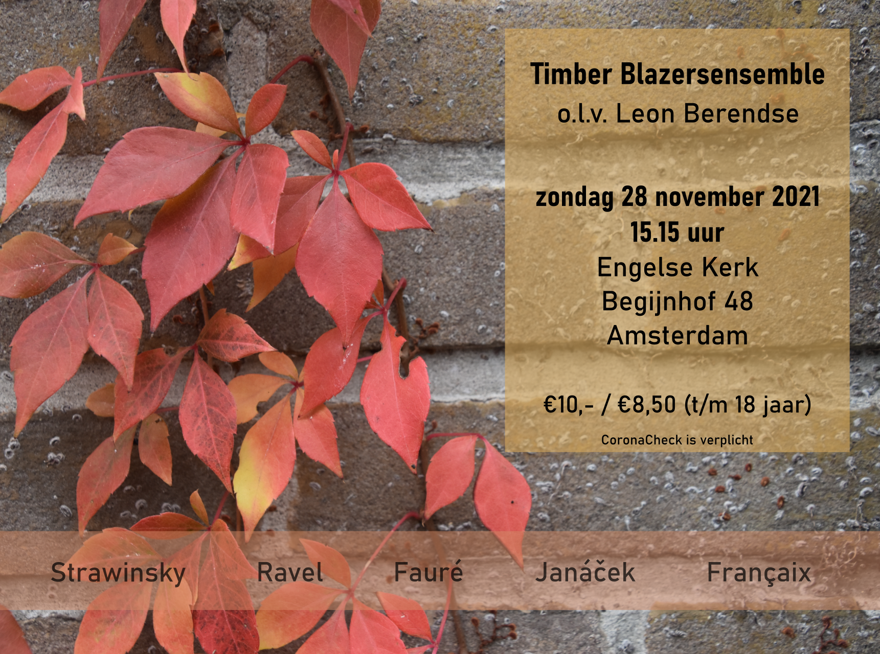 Timber, led by Leon Berendse, consists of a double wind quintet and a double bass. They will play a wonderful selection of pieces, ranging from dreamy autumn colors to more boisterous tones.